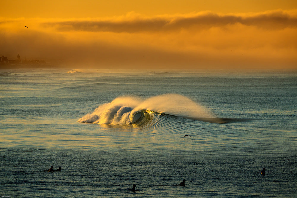 As the golden dawn light pierces through the dissipating fog, the ocean transforms into a stage where waves create a magnificent playground.