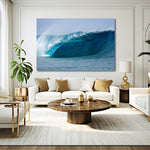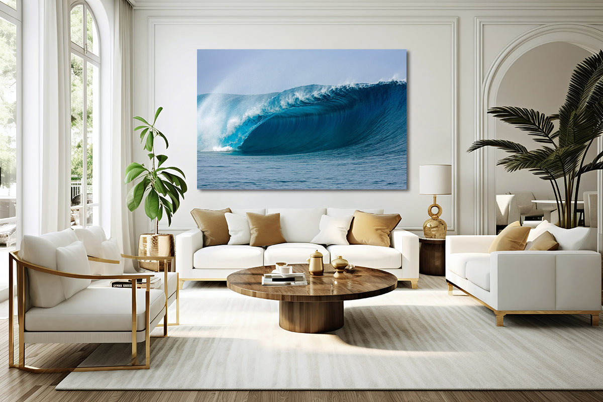 This fine art photograph captures the legendary Teahupoo wave in Tahiti, renowned for its breathtaking power and perfectly sculpted, hollow tube.