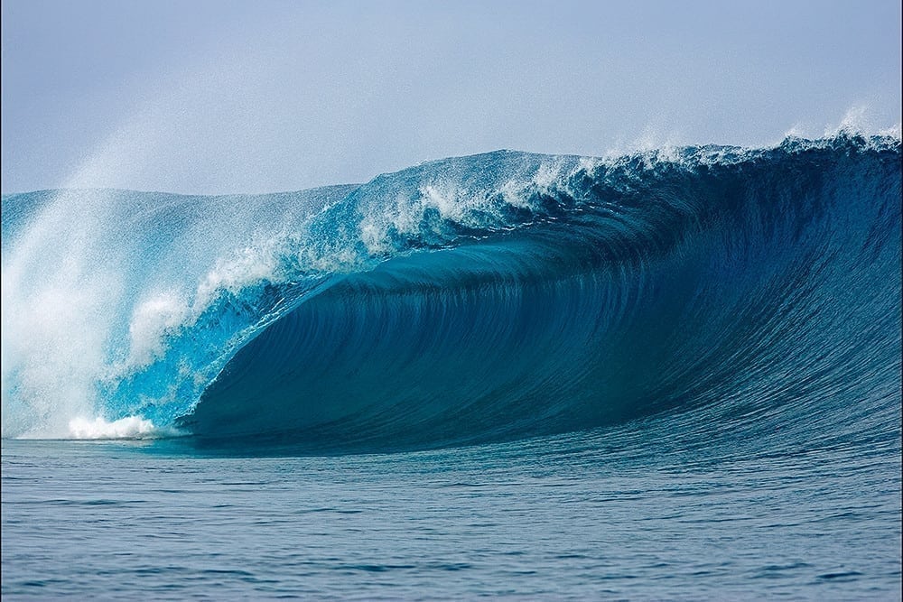 The image showcases the wave’s dramatic form as it rises abruptly over a shallow coral reef, creating a mesmerizing wall of water that is both beautiful and formidable.
