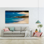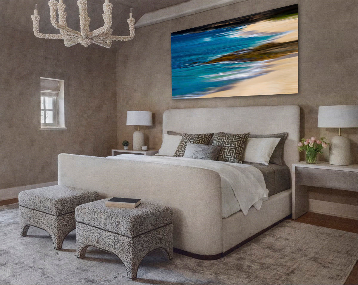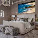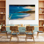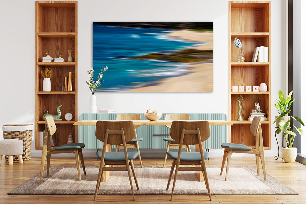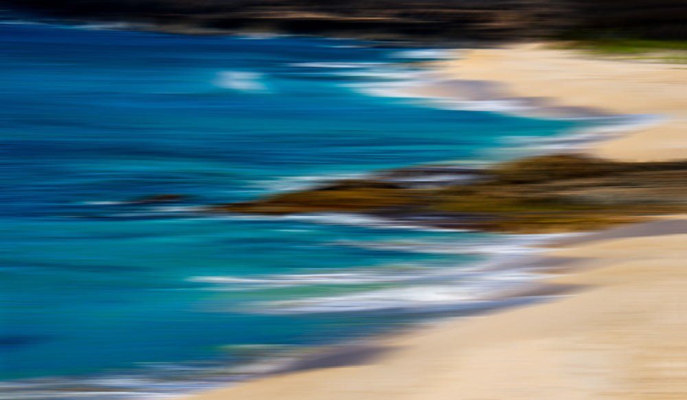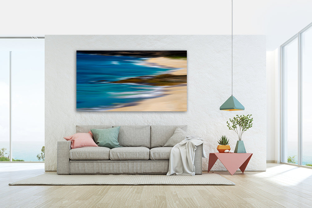 Tonal turquoise waters ebb and flow in tropical paradise, framed by lava at the far end of the beach and moss-covered reef in the middle. Feel the sand between your toes and hear the rhythmic movement of the surf in this abstract interpretation of pure Hawaii.
