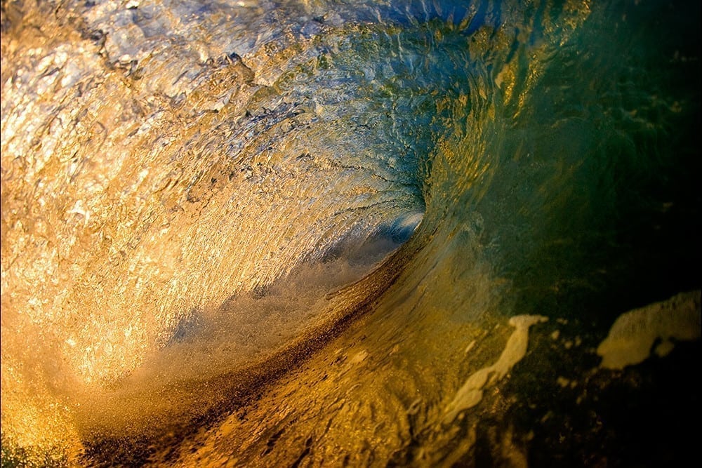Aaron's photo captures the powerful motion of a wave from the inside, revealing the intricate texture of the wave’s glassy barrel as sunlight filters through its crystalline form.
