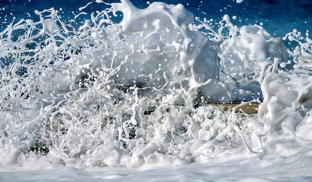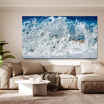 The powerful surge of ocean waves creates a mesmerizing spectacle as white water explodes into a dynamic dance, simultaneously revealing glimpses of sandy shore below and cobalt sky above.