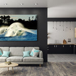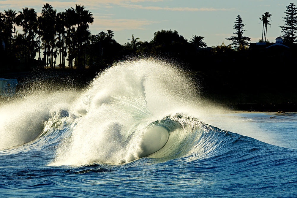 The silhouettes of palm trees stand in the background against a soft, pastel sky, creating a dramatic contrast with the dynamic energy of the wave. The late afternoon light casts the scene in a dreamlike quality, with the wave’s translucent form catching the sunlight as it arcs gracefully toward the shore.