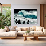Silhouetted swimmers enjoy the surf at Waimea Bay on Oahu’s North Shore, framed by dramatic turquoise waves and glistening water.