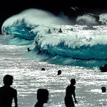 The dramatic light, shadow, and motion creates a timeless summer scene of people playing in the surf at Waimea Bay.
