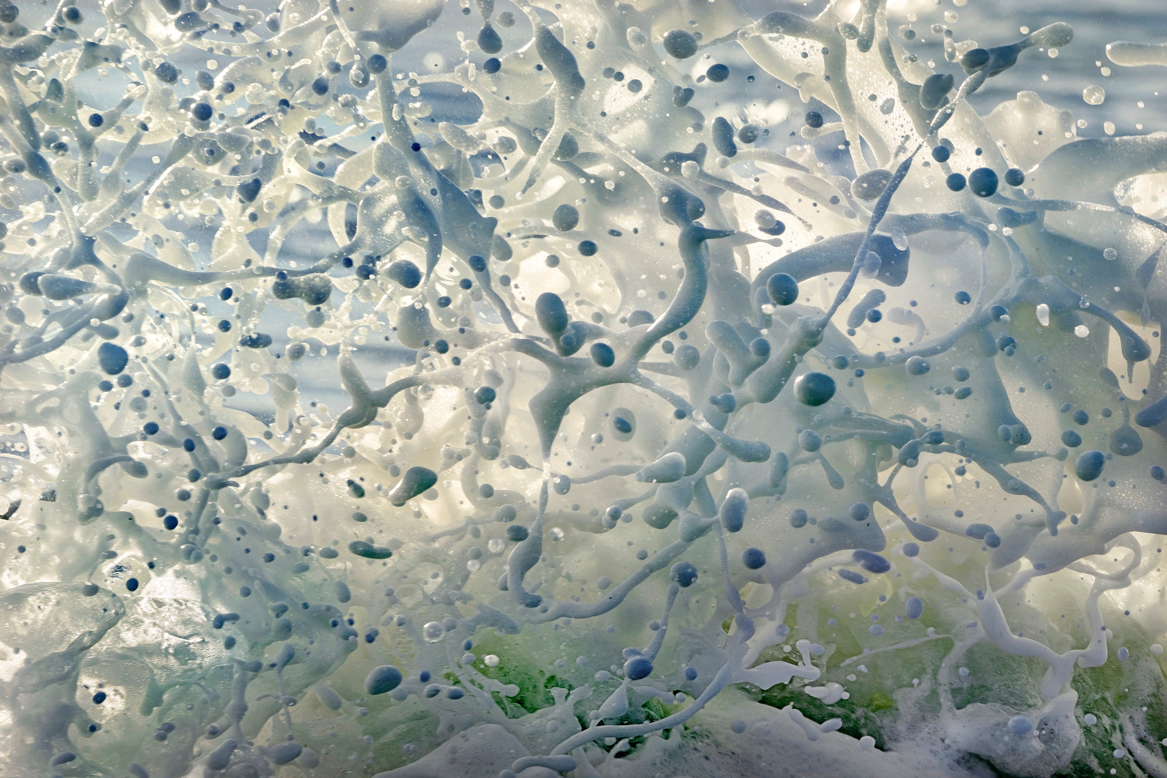 Backlit by the sun, intricate threads of water and suspended pearls of sea foam create a mesmerizing, three-dimensional dance.