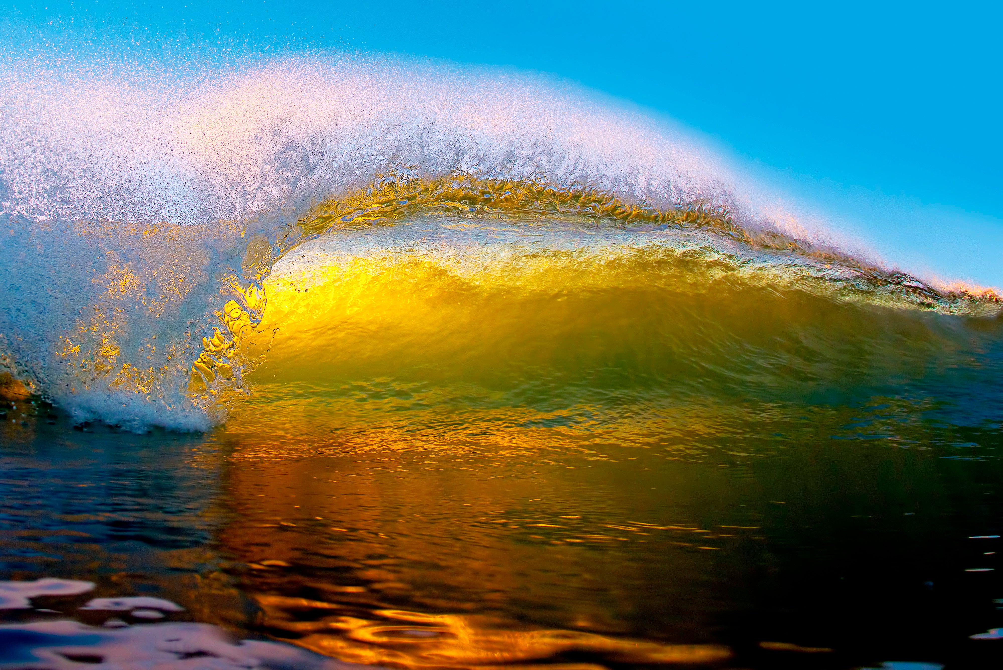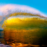 Bathed in the golden glow of a setting sun in Solana Beach, CA, this fine art photograph captures a wave at the precise moment it crests, illuminated from within by the fiery colors of dusk.