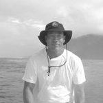 Cloud wisps highlight the infinite horizon as Aaron speeds toward the surf in a boat. The image evokes a profound sense of tranquility and serenity, with its ombre tones of blue creating a meditative, calming quality.