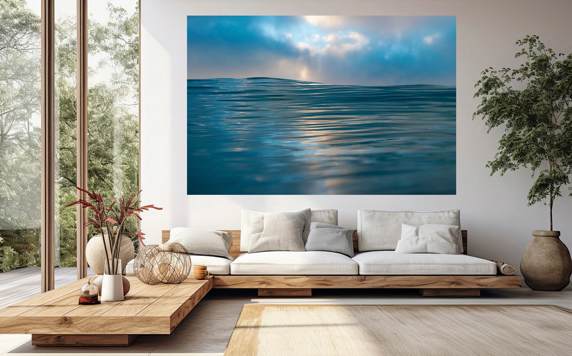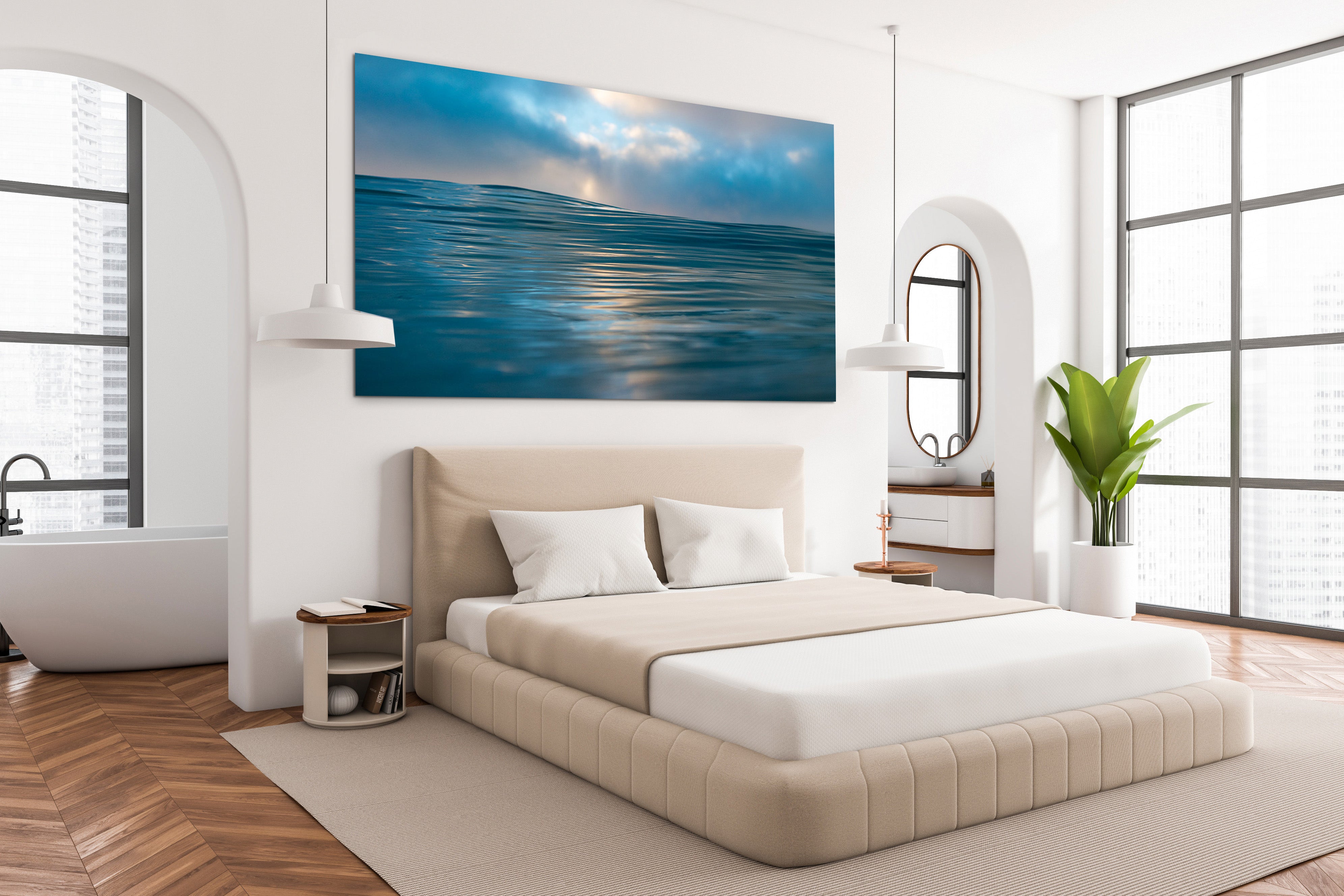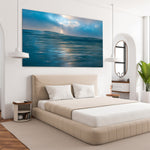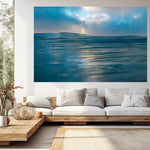 This fine art photo captures the serene beauty of the ocean’s surface, its gentle ripples reflecting soft hues of blue and gold.