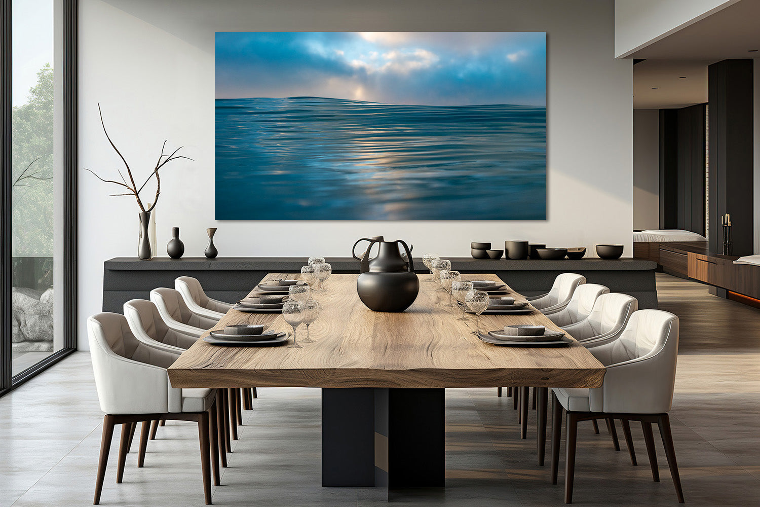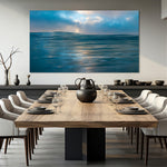 The calm water, paired with the subtle glow of light filtering through the clouds, creates pure tranquility. The horizon blurs seamlessly into the sky, evoking a sense of infinite peace and stillness.