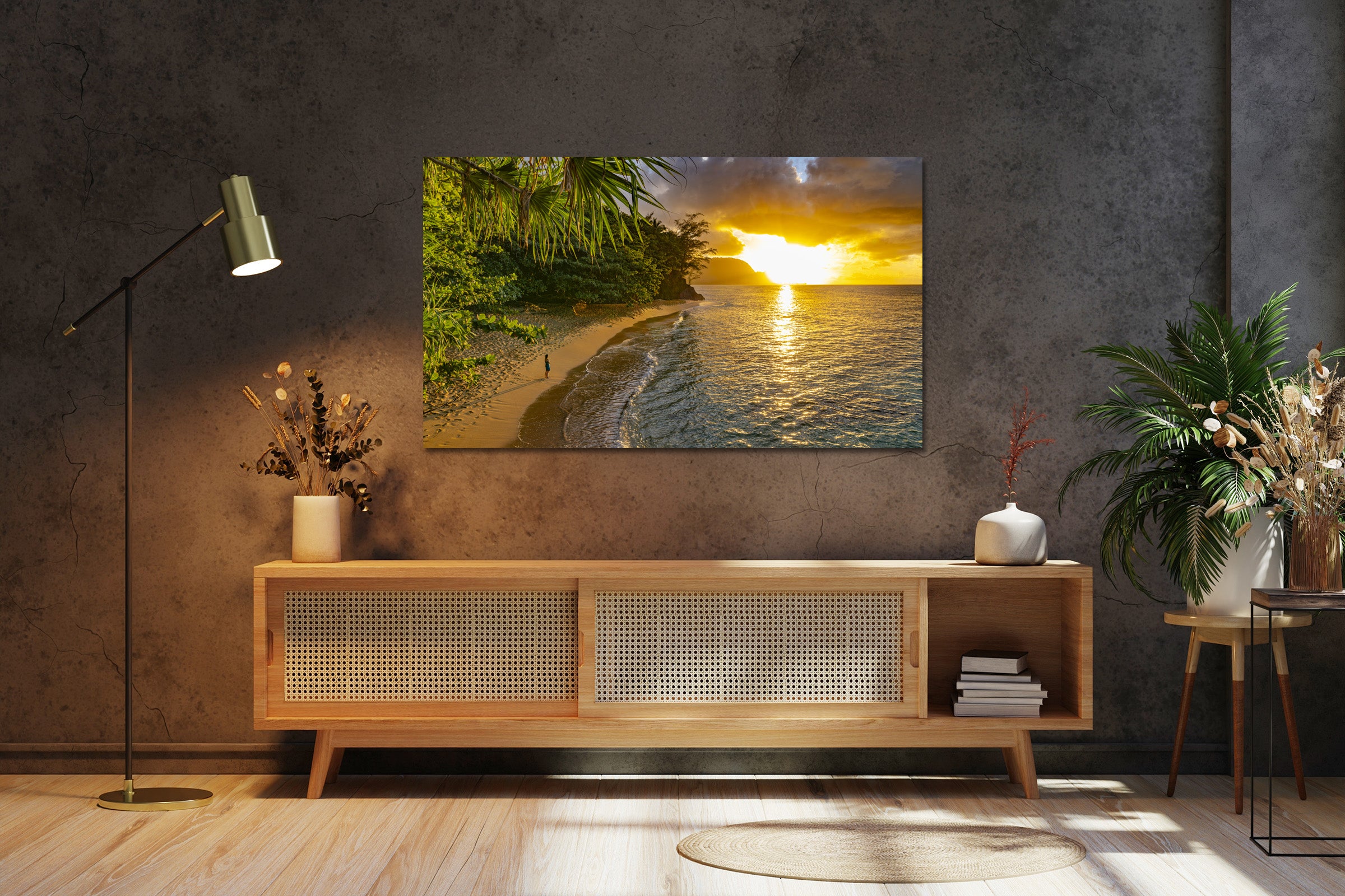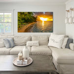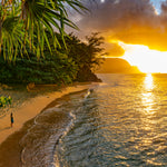 The sun dips behind dramatic cliffs, casting a radiant light across the ocean and sky. The scene perfectly embodies the serene and unspoiled beauty of Kauai’s north shore.