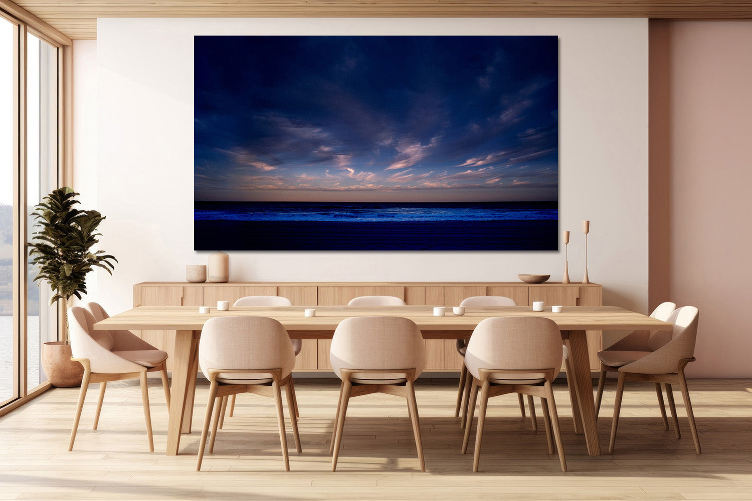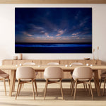 This breathtaking seascape masterfully balances the tranquility of dusk with the dynamic energy of the ocean, creating a contemplative space with its serene yet powerful presence.