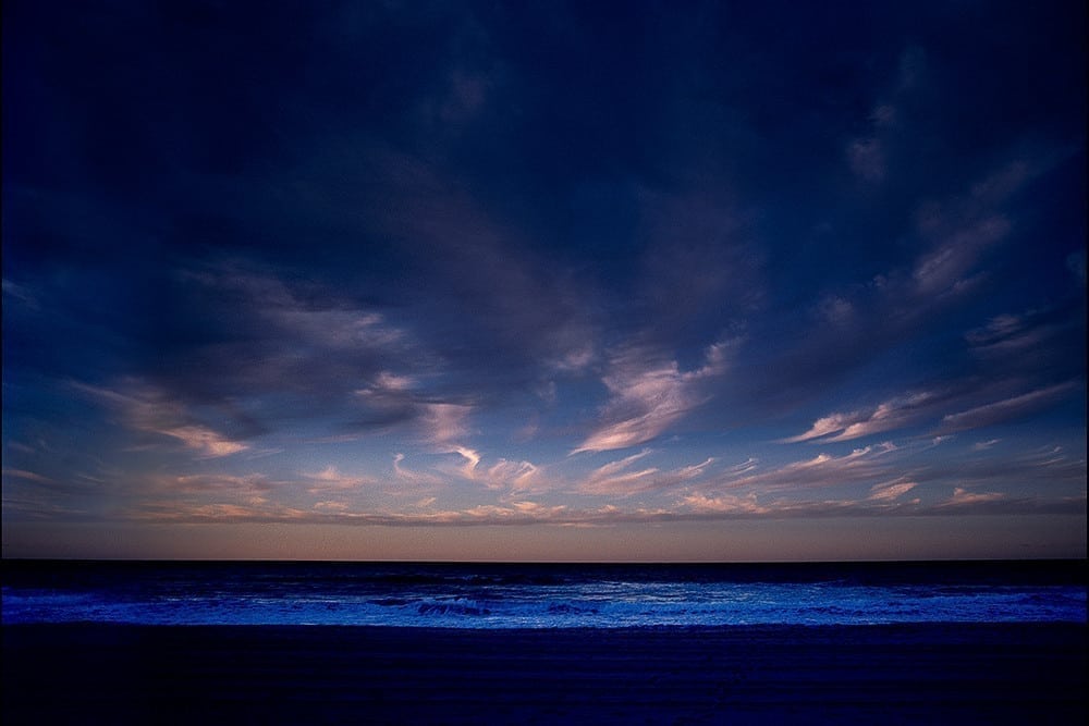 Below, the ocean glows with an ethereal blue luminescence as gentle waves roll toward the darkened shoreline.