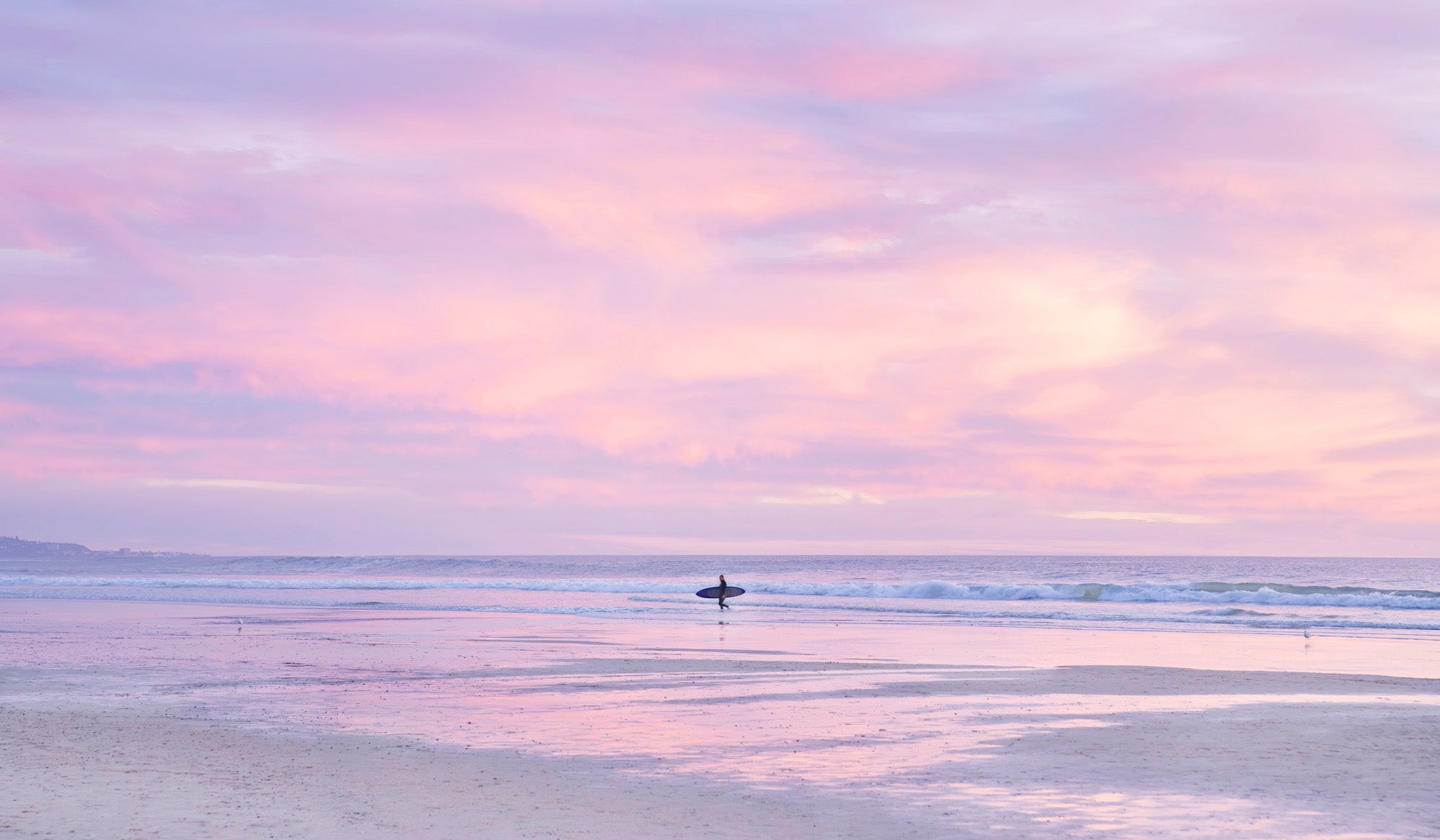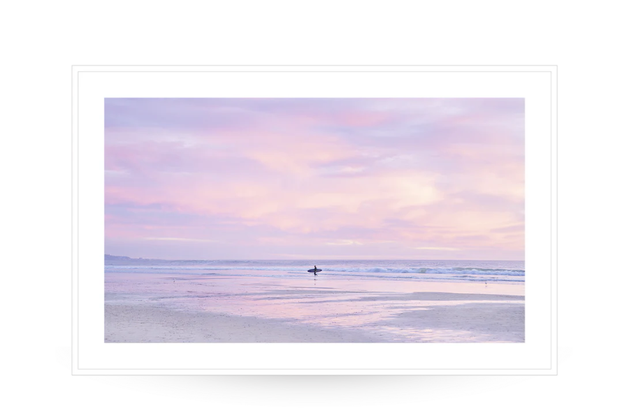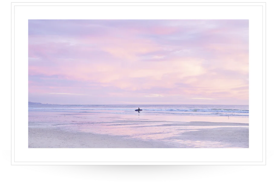 Bathed in the ethereal haze of early morning, Momentum captures the quiet power of the Pacific as a solitary surfer moves with the pulse of the ocean.