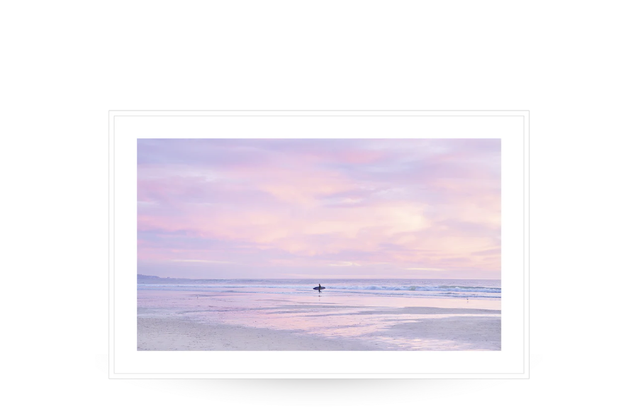 Each piece in Aaron’s Calm Collection is presented in a premium white Italian frame—a refined, timeless profile rarely offered by the artist.