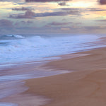 Immerse yourself in the tranquil beauty of this fine art photograph, walking along a warm beach at sunrise, where the gentle waves of the Hawaiian Pacific gracefully sculpt the soft, golden sand.