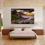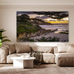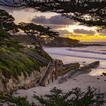 This breathtaking sunset at Carmel Beach showcases the iconic Cypress trees framing a golden sky, with dramatic clouds reflecting vibrant yellows and oranges over the Pacific Ocean.