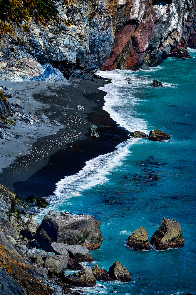 The ocean displays a palette of blue from indigo to turquoise on the fine black sand of the Lucia Coast in Big Sur.