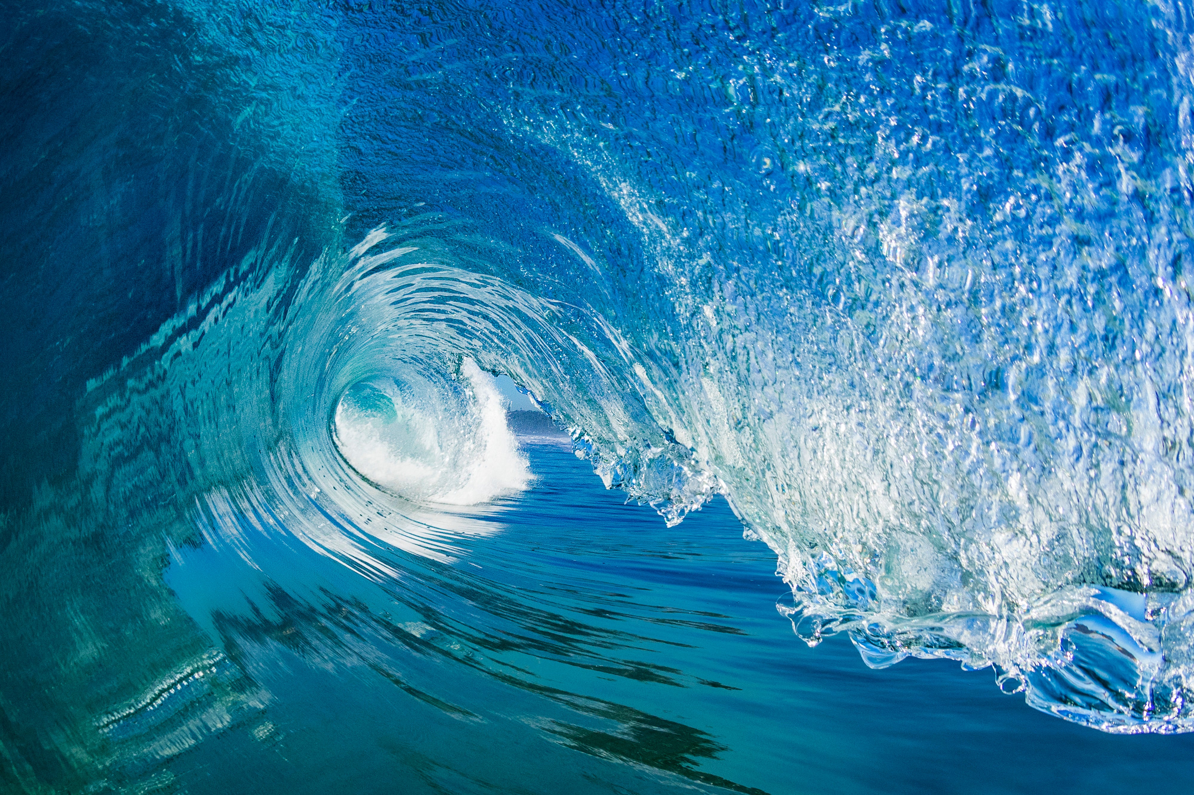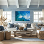 The image draws viewers into the motion of the ocean, revealing intricate patterns and textures in the water, all rendered in radiant shades of blue and turquoise.
