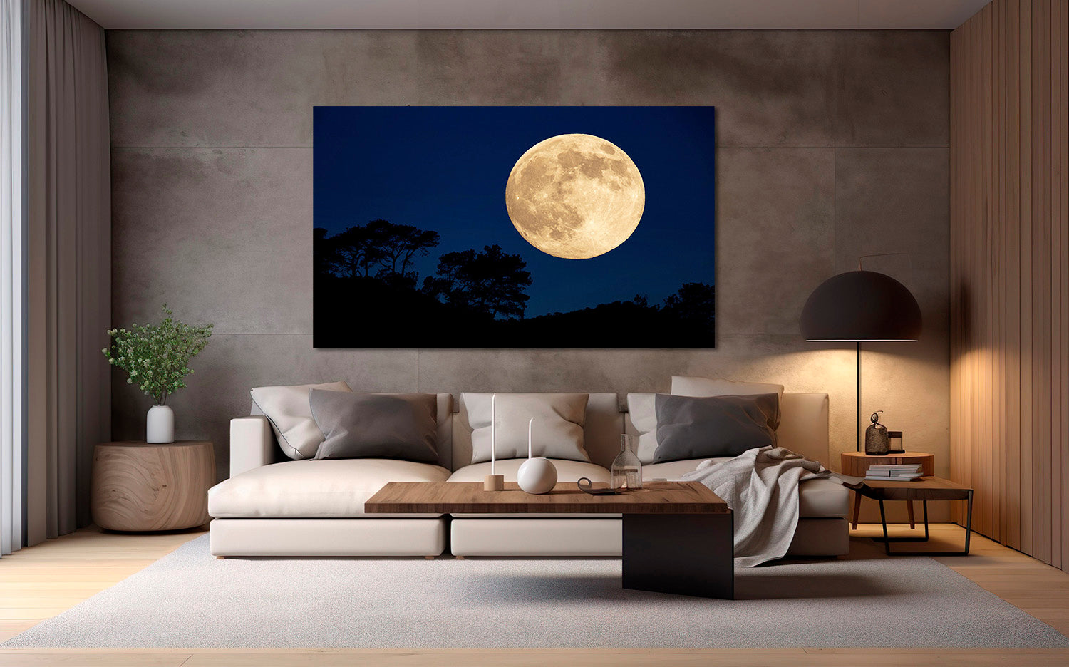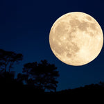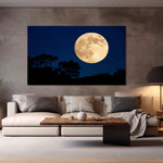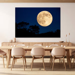 A magnificent supermoon glows golden against the deep midnight blue sky, hovering majestically above the silhouetted treeline.
