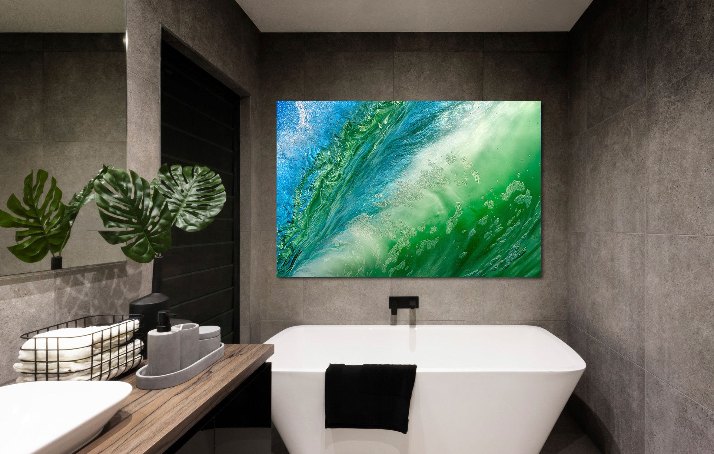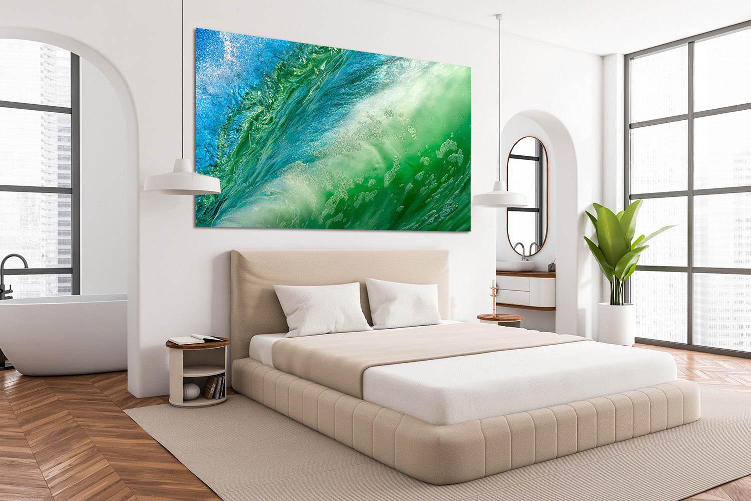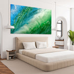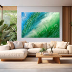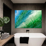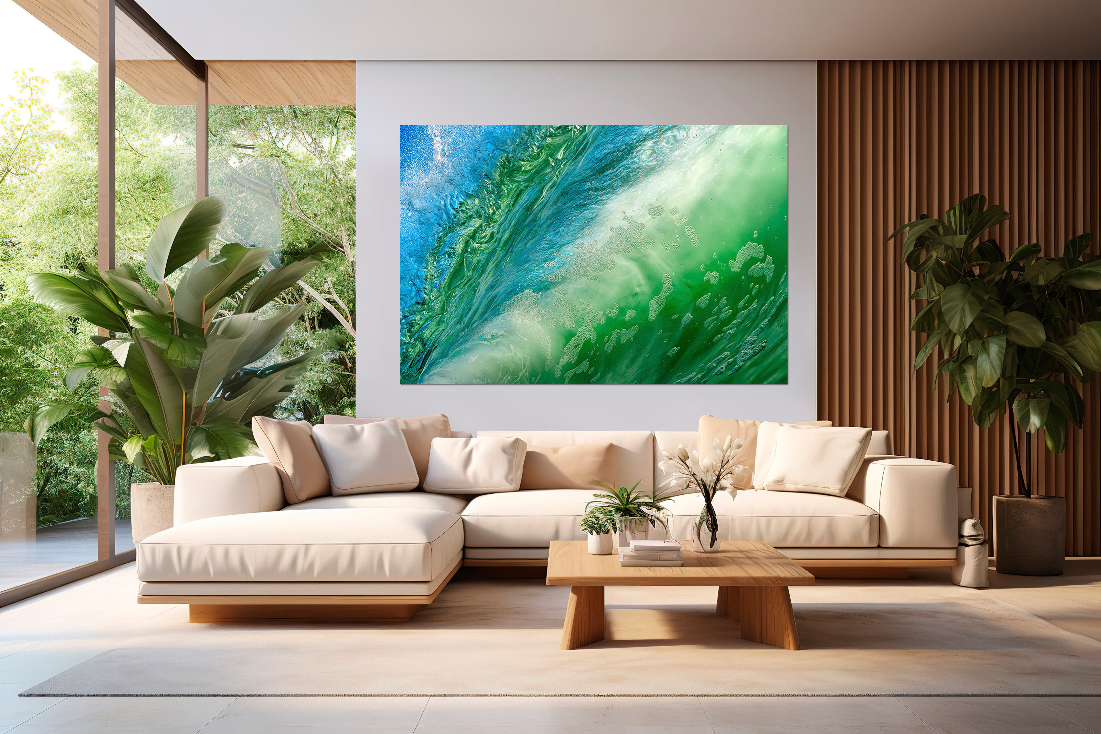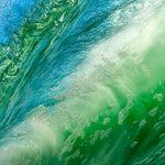 This captivating fine art photograph captures the mesmerizing detail of a wave in motion, showcasing a stunning gradient of blues and greens that mirror the natural palette of the ocean.