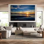 The extreme low tide has revealed smooth, mirror-like sand that perfectly reflects the dramatic sky above— deep blues transitioning to vibrant oranges and yellows near the setting sun.