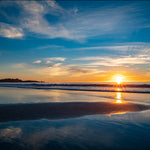 A breathtaking sunset unfolds over Carmel Beach, where the golden sun hovers just above the horizon, casting a brilliant pathway of light across the tranquil Pacific waters.