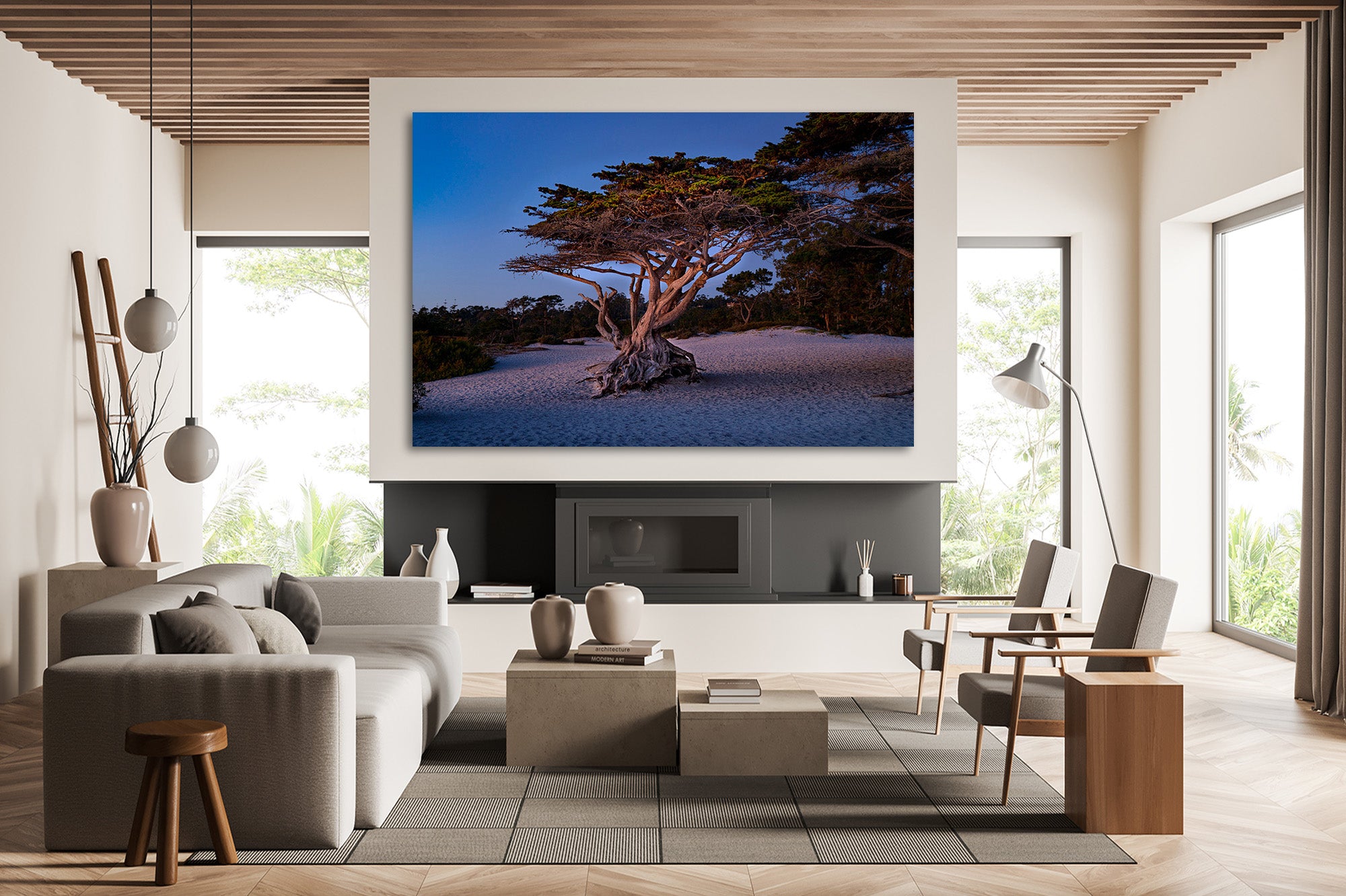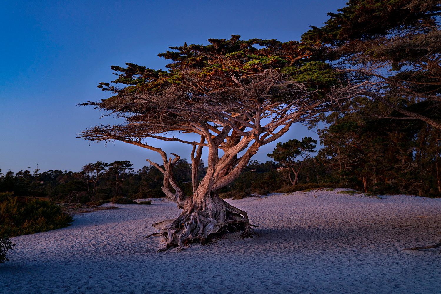 A resilient cypress tree sculpted by offshore winds over time is surrounded by the soft white sand of Carmel Beach, inviting quiet contemplation. The warm evening light bathes the scene, highlighting the tree’s unique shape and the surrounding coastal landscape.