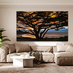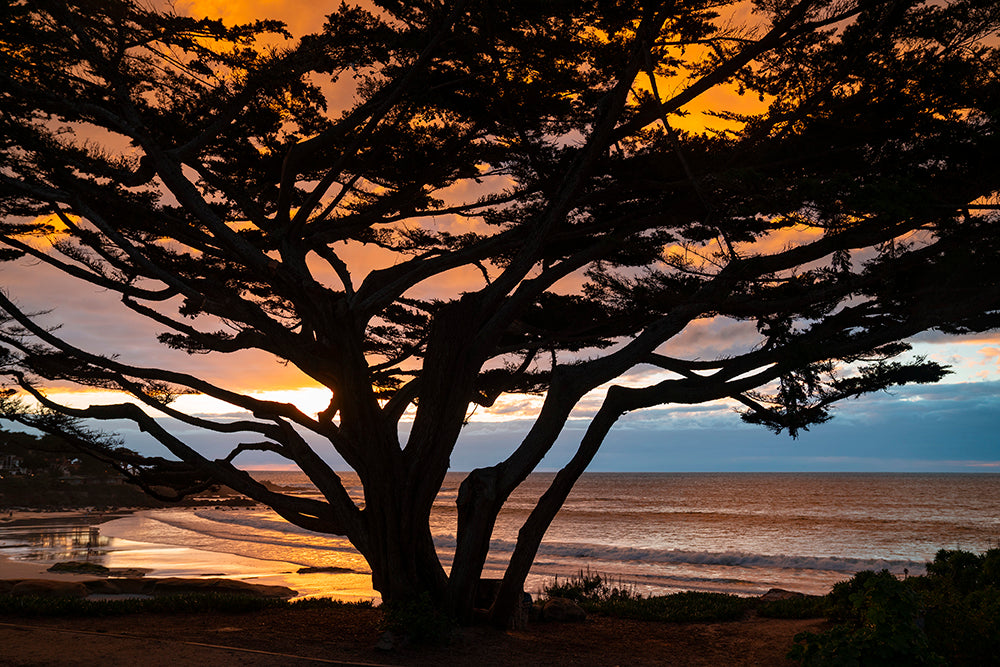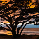 This majestic Monterey Cypress tree stands as a silent sentinel at the southern end of Carmel Beach, its distinctive silhouette dramatically framed against the golden-orange glow of the setting sun.