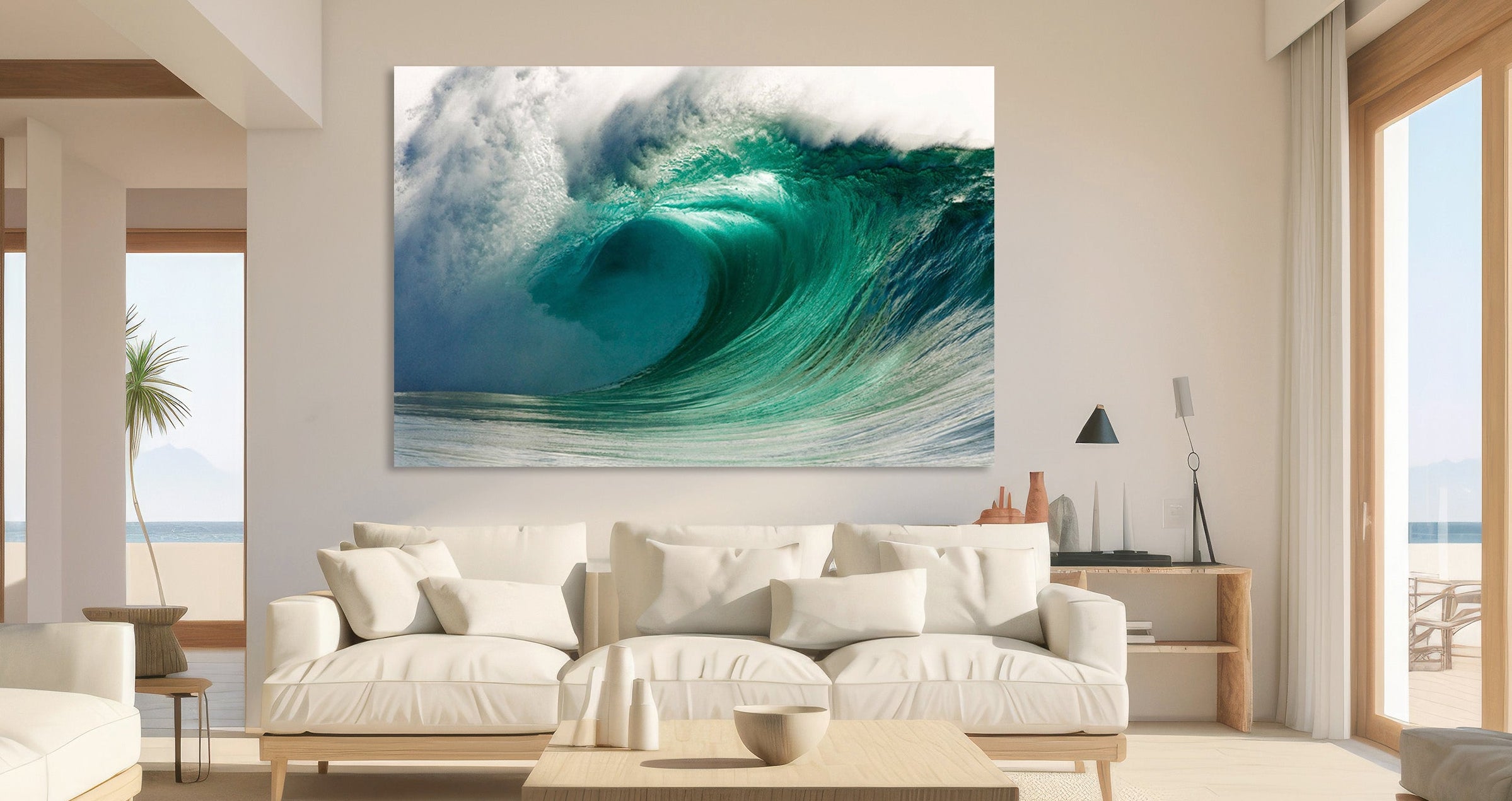 The dynamic composition evokes awe at the sheer force of the ocean's power, making it an ideal feature piece, especially at large scale.