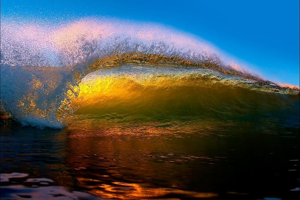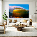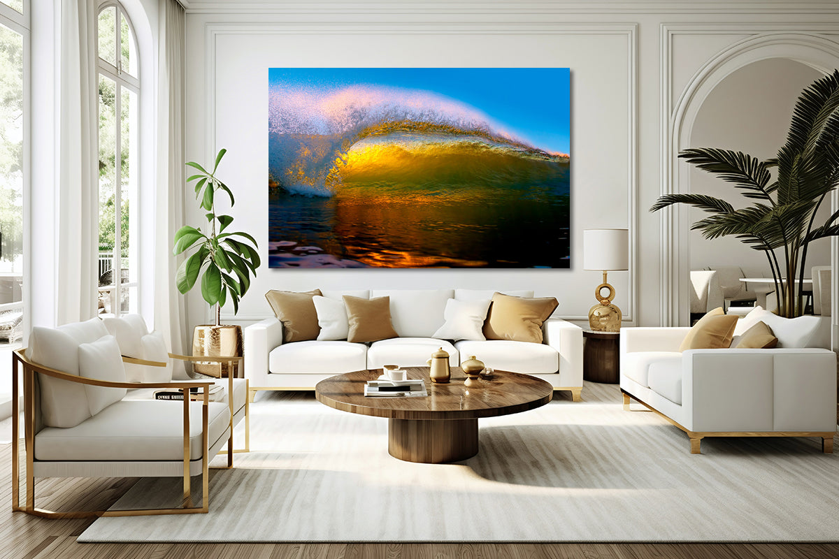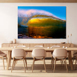 Bathed in the golden glow of a setting sun, this fine art photograph captures a wave at the precise moment it crests, illuminated from within by the fiery colors of dusk.