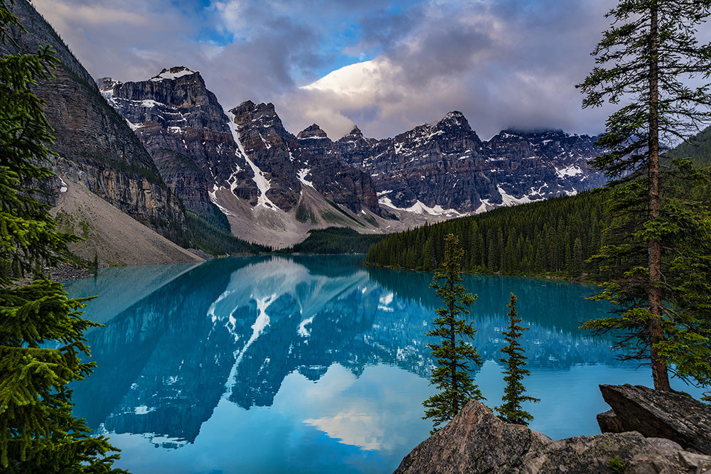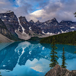 This fine art photograph captures Moraine Lake in Banff National Park, showcasing its signature turquoise waters that perfectly mirror the dramatic Valley of the Ten Peaks.