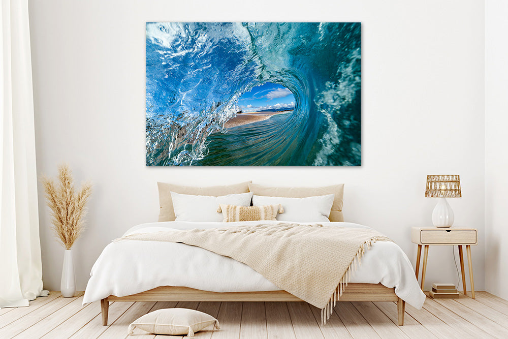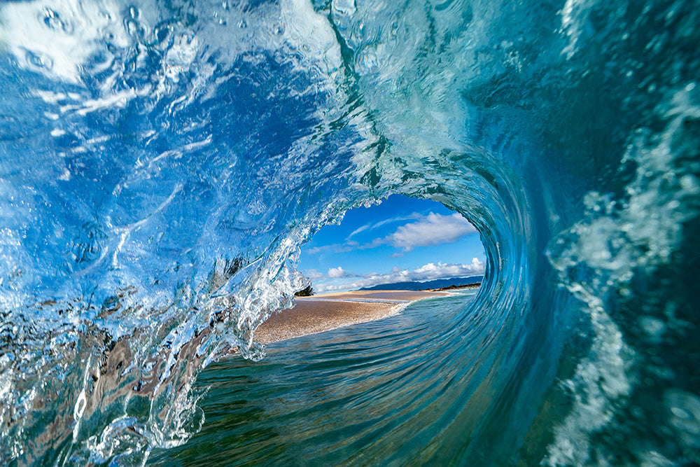 A glassy beach break wave refects the cobalt sky as billowy clouds float by... This photo masterfully captures a glorious sunny morning in the pristine tropical waters of Hawaii.