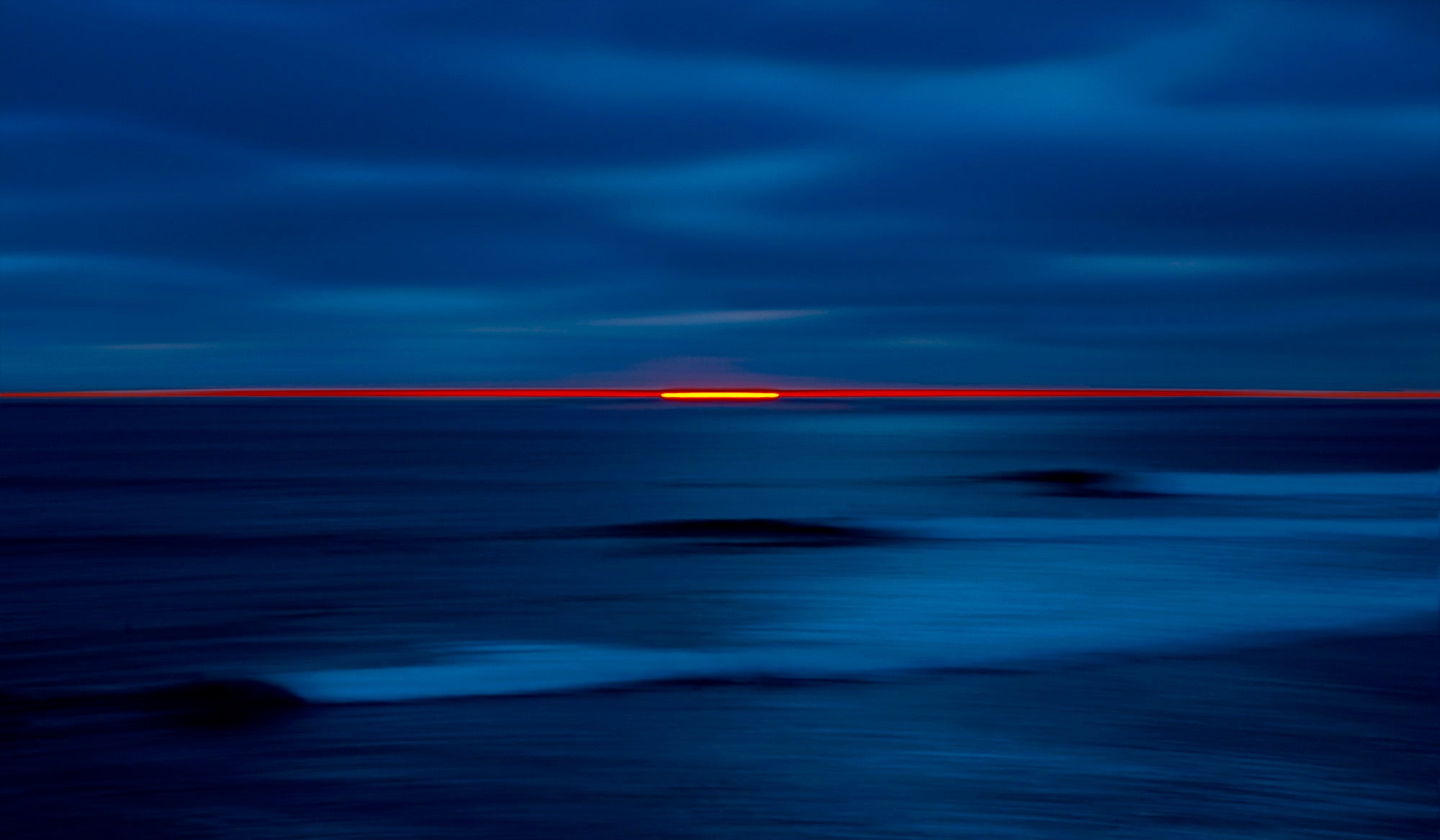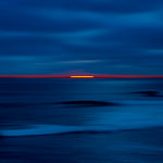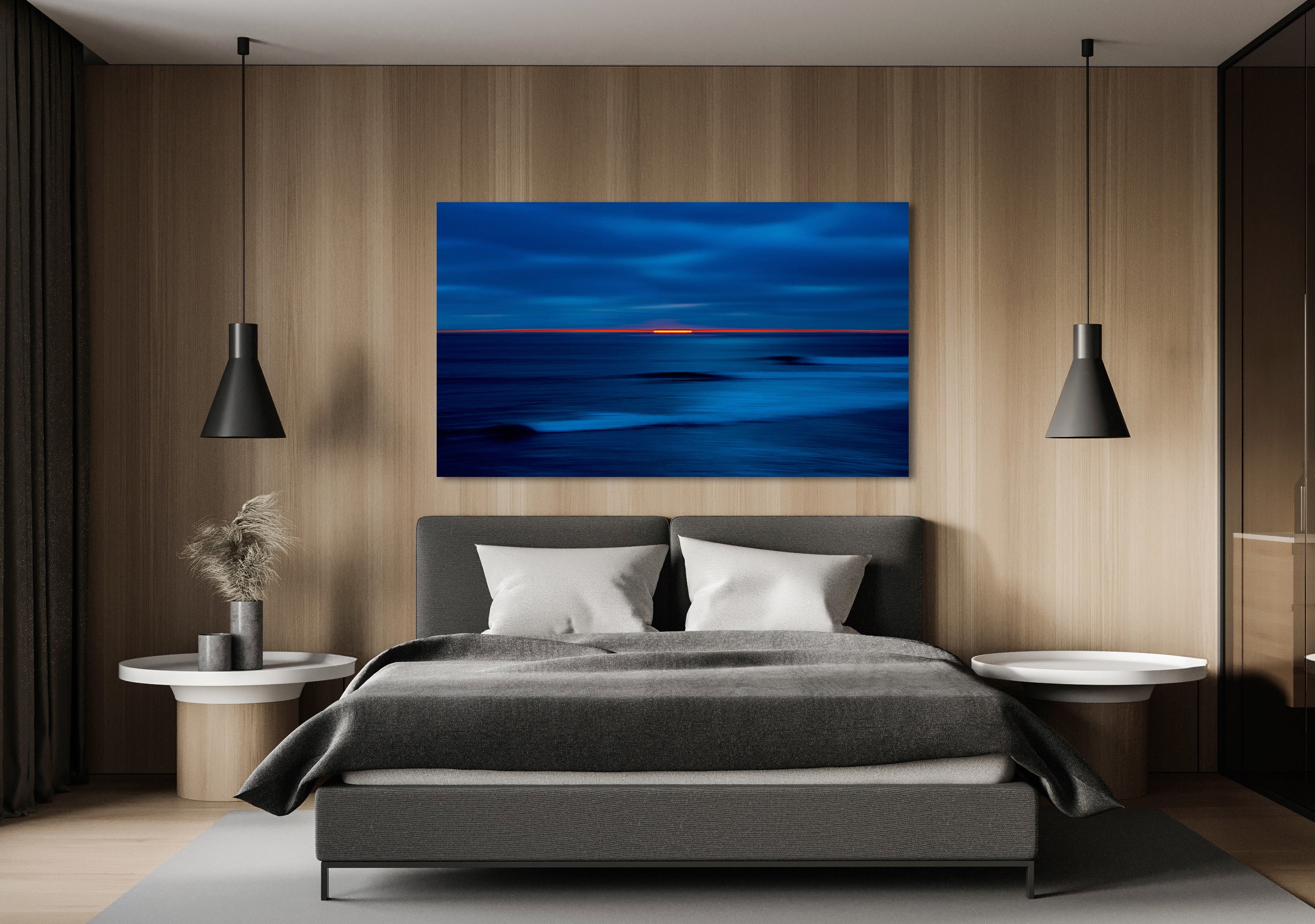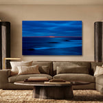 Inception is a captivating fine art piece characterized by its deep blue oceanic tones contrasted with a striking horizontal line of fiery red and orange sunset during the last moment of light.