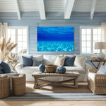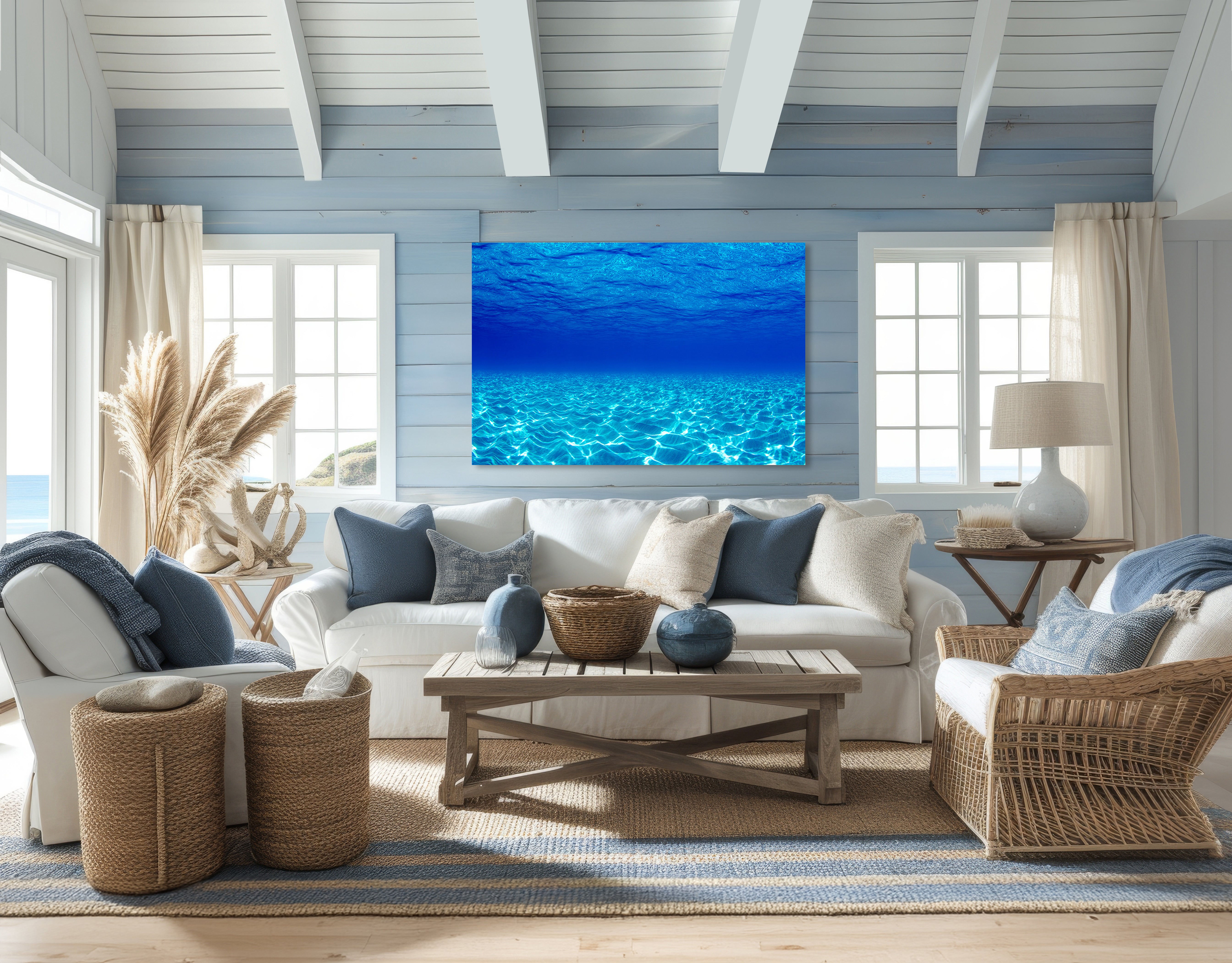 Sunlight dances across the rippled ocean floor, creating a luminous tapestry of blue that seems to stretch beyond the horizon. This captivating image evokes a sense of boundless freedom and peace, celebrating the infinite allure of the sea’s depths.
