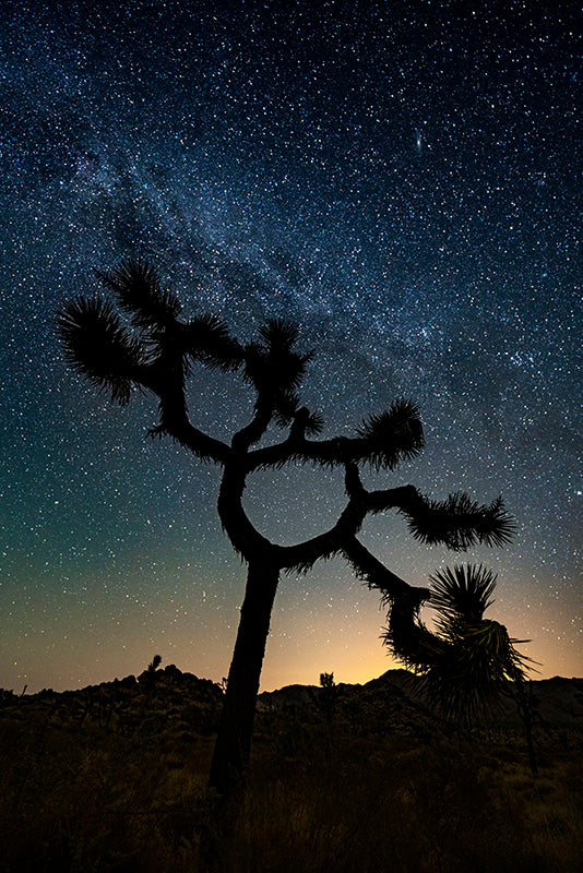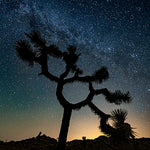 A Joshua tree signals its age of antiquity to the stars with this infinity sign, set against a moonless sky with the stars of the universe light years away.
