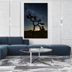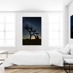 The tree’s unique form, with limbs outstretched toward the heavens, create a dramatic contrast with the star-filled sky, where countless stars shimmer amidst the milky way in hues of blue and white.