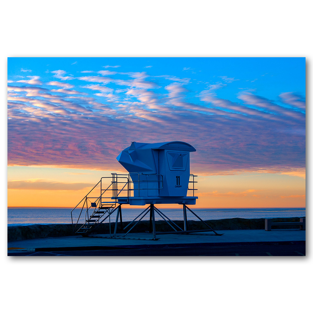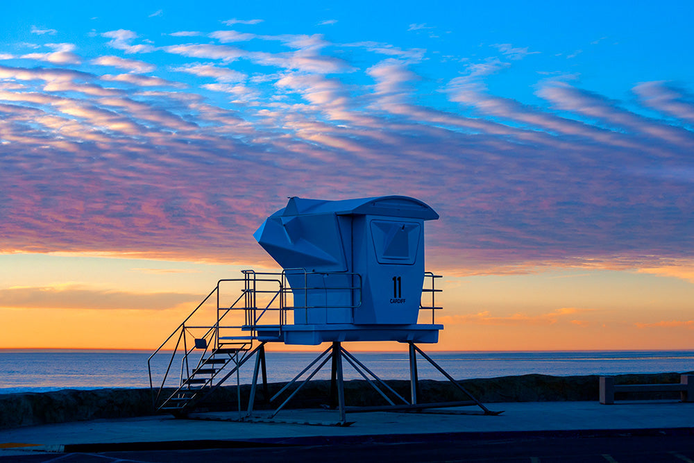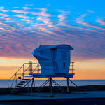 Summer memories come alive at the sight of a lifeguard tower, iconic for carefree days at the beach. The tower is set against a stunning summer sunset. The end of a perfect day at the beach.
