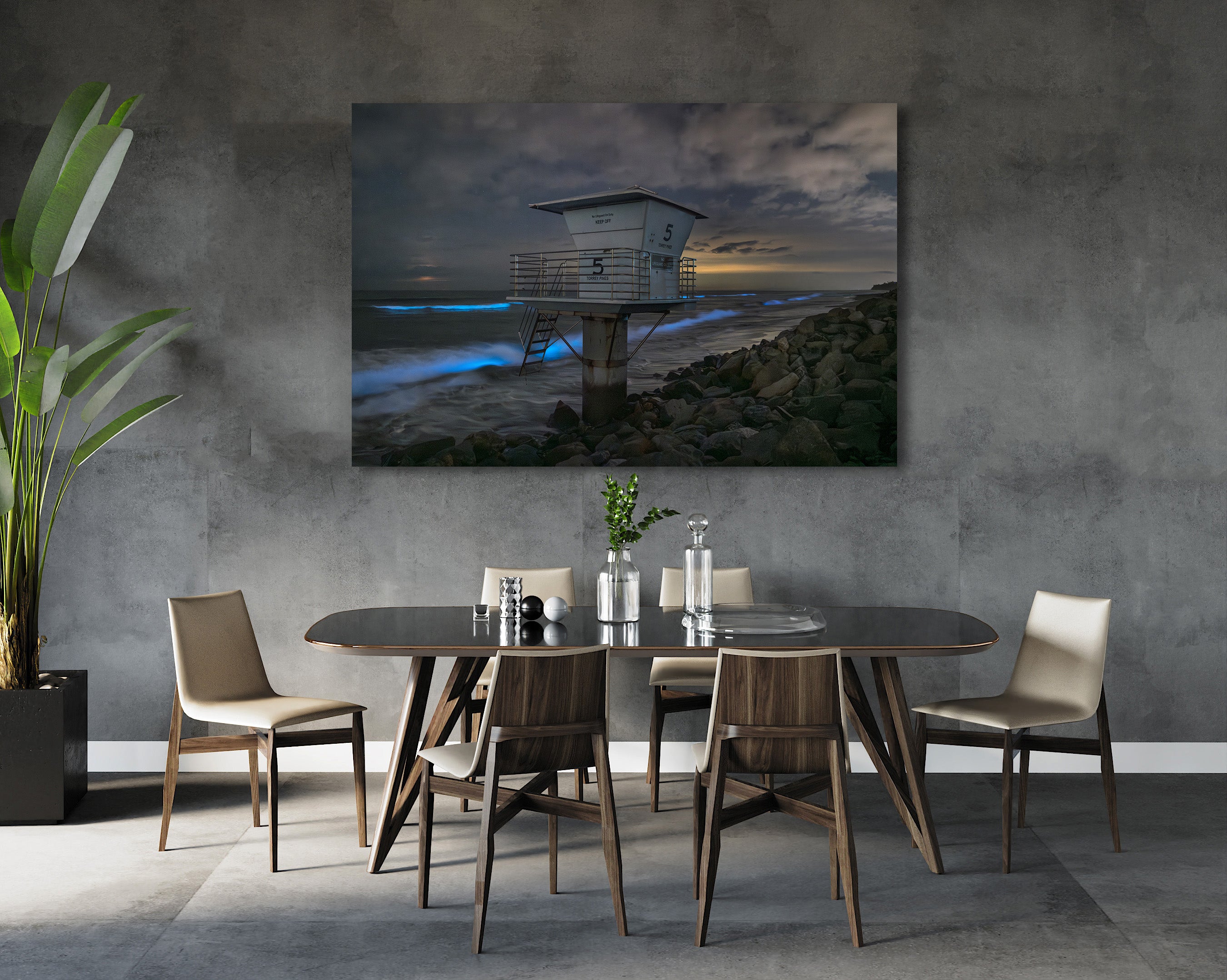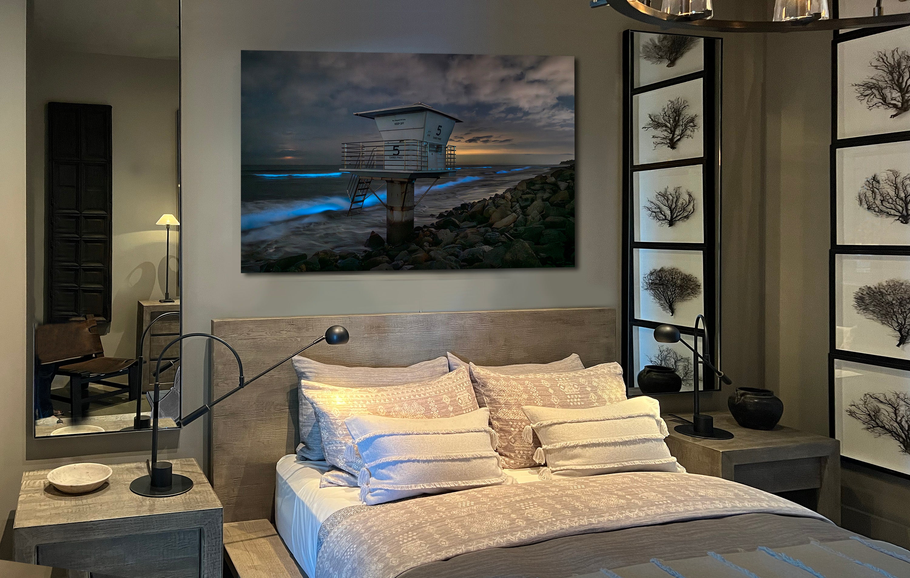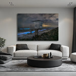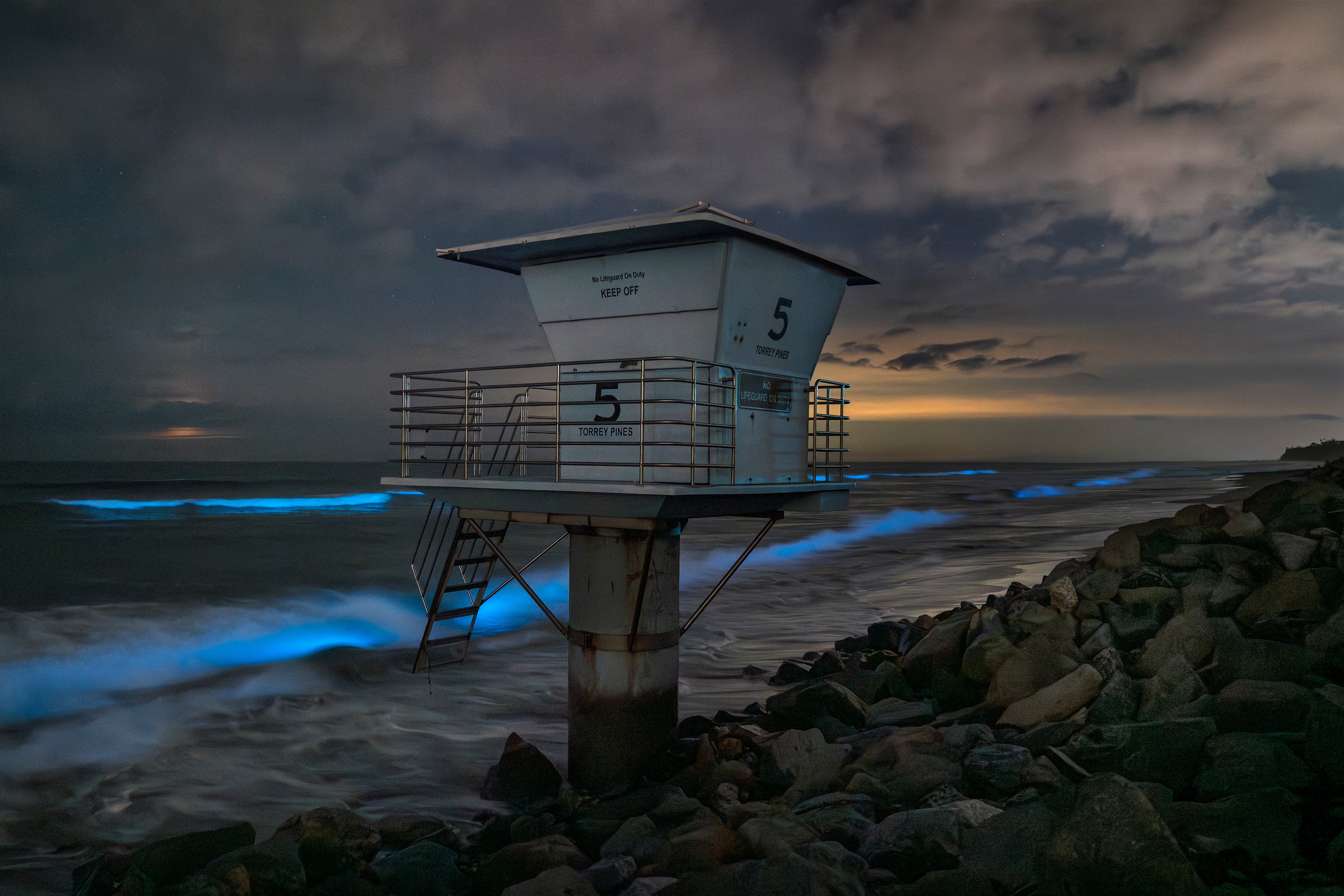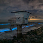 Midnight waves pulse electric blue as bioluminescence ignites beneath the Torrey Pines lifeguard tower in this evocative new fine art photograph by Saxon Chang.