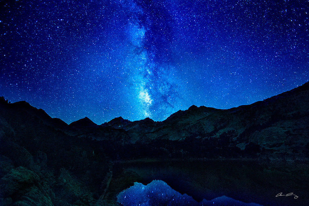 Milky Way, captured in the Eastern Sierra Mountains, reveals the stunning brilliance of our galaxy arched above rugged peaks and alpine lake reflections.