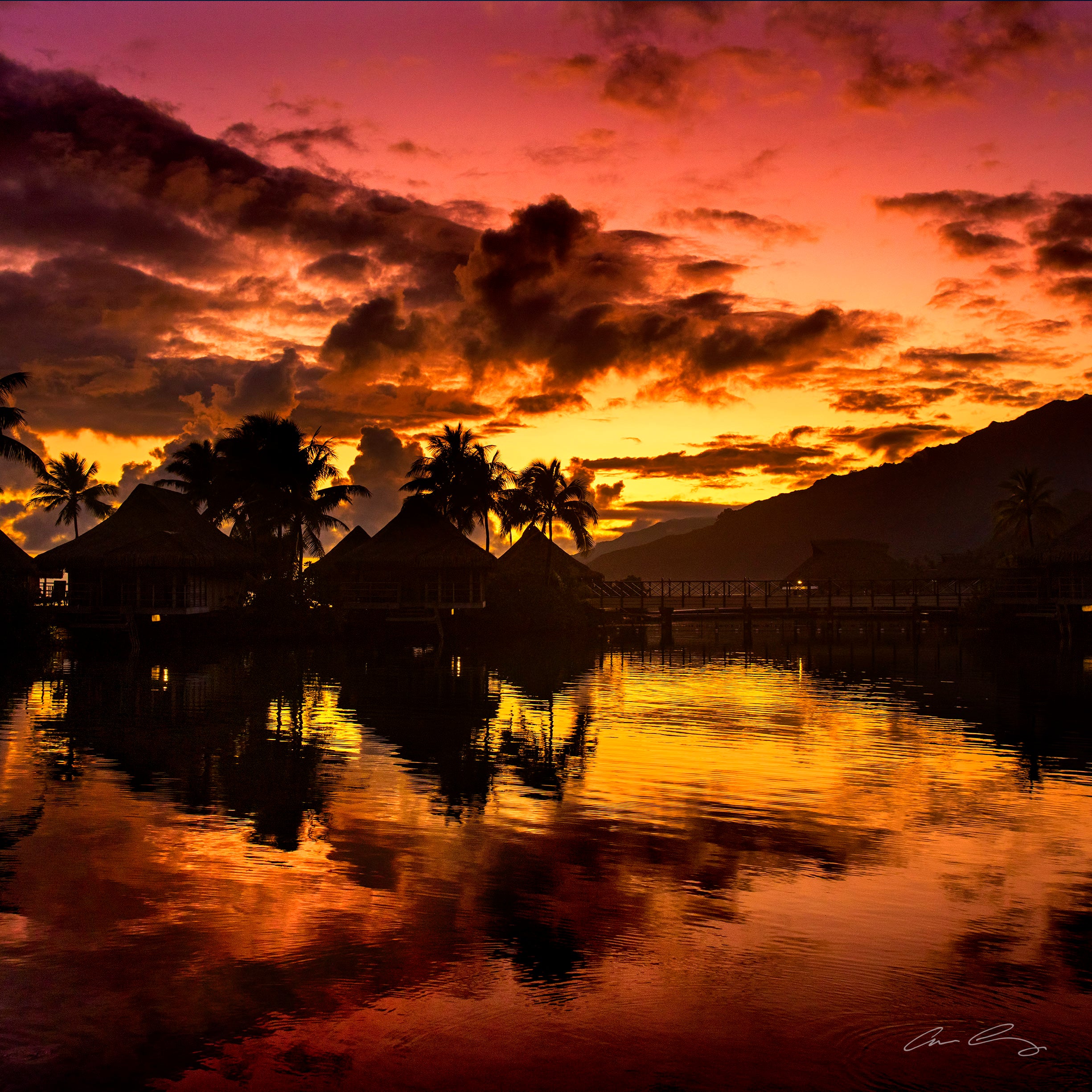 Nirvana is a 12” x 12” metal art piece featuring an evocative sunset in Tahiti, where dramatic clouds and vibrant colors are mirrored on tranquil waters.