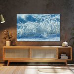 The dynamic spray creates a mesmerizing display of movement and energy, with translucent blues and foamy whites creating abstract shapes frozen in time. This uplifting artwork brings the refreshing spirit and pure joy of the ocean’s playful power into any space, celebrating the invigorating beauty of crashing waves.