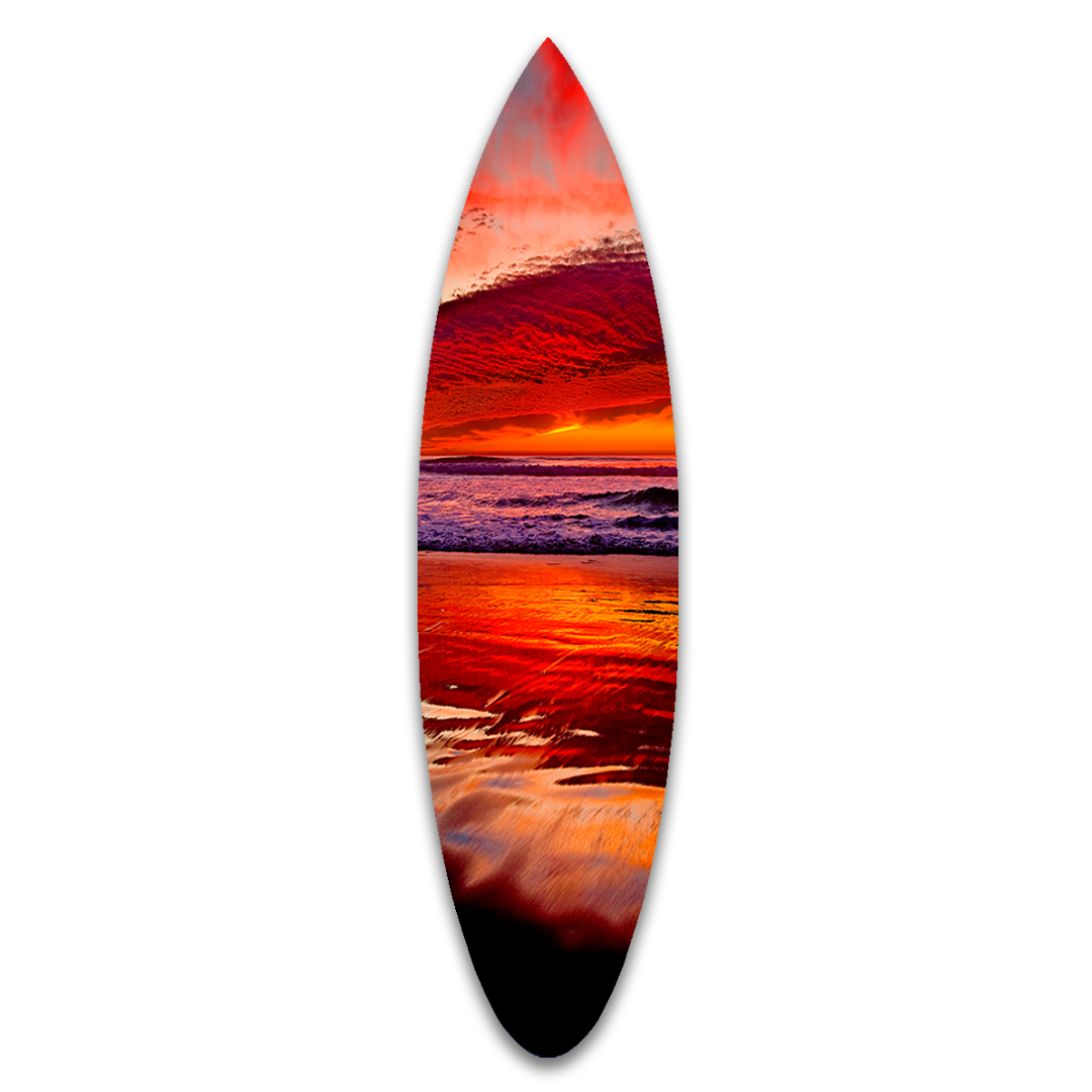 A magnificent study in color and texture, this sunset was shot in Cardiff-by-the-Sea. This beach seascape photograph is an epic reminder of California’s beauty. Using state of the art pigment printing directly onto fiberglass, this shortboard is printed in high resolution, resulting in tremendous color and depth. Also available as a horizontal longboard and horizontal shortboard.