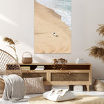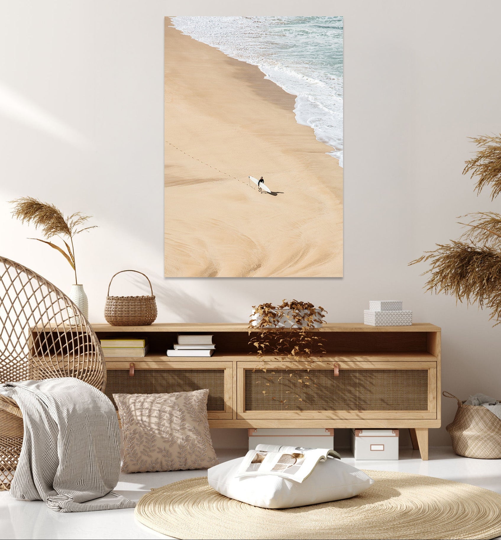 Footprints trail in the sand behind the surfer, evoking a sense of peaceful determination and the deeply personal connection between a person and the sea. This piece celebrates the quiet pilgrimage to face the power of the ocean, embodying a pure and focused spirit