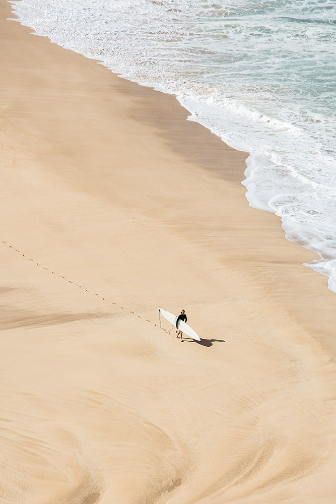 Soul Surfer, captured at Oahu’s legendary Waimea Bay, portrays a solitary figure’s quiet journey across a vast expanse of golden sand toward the water’s edge.
