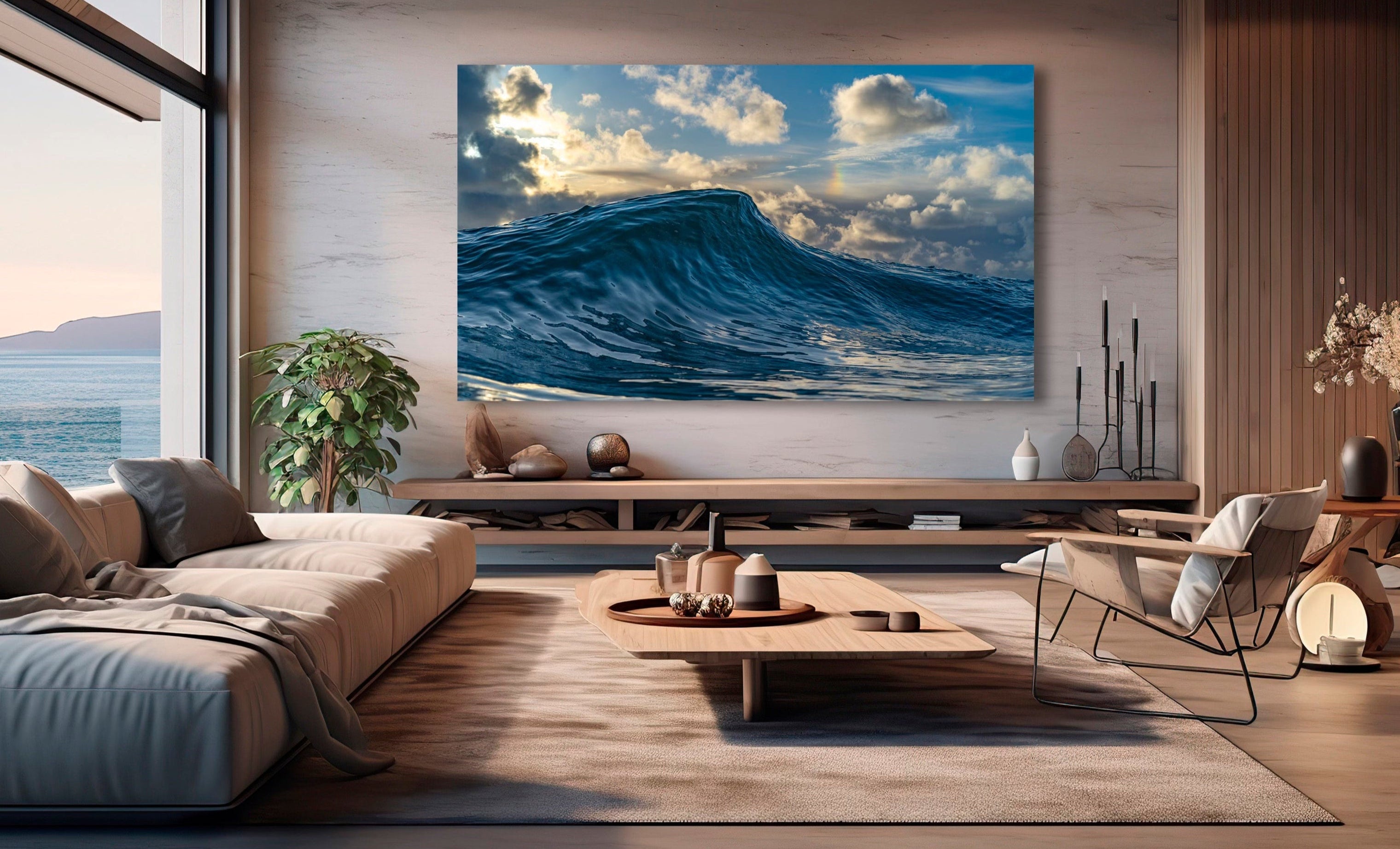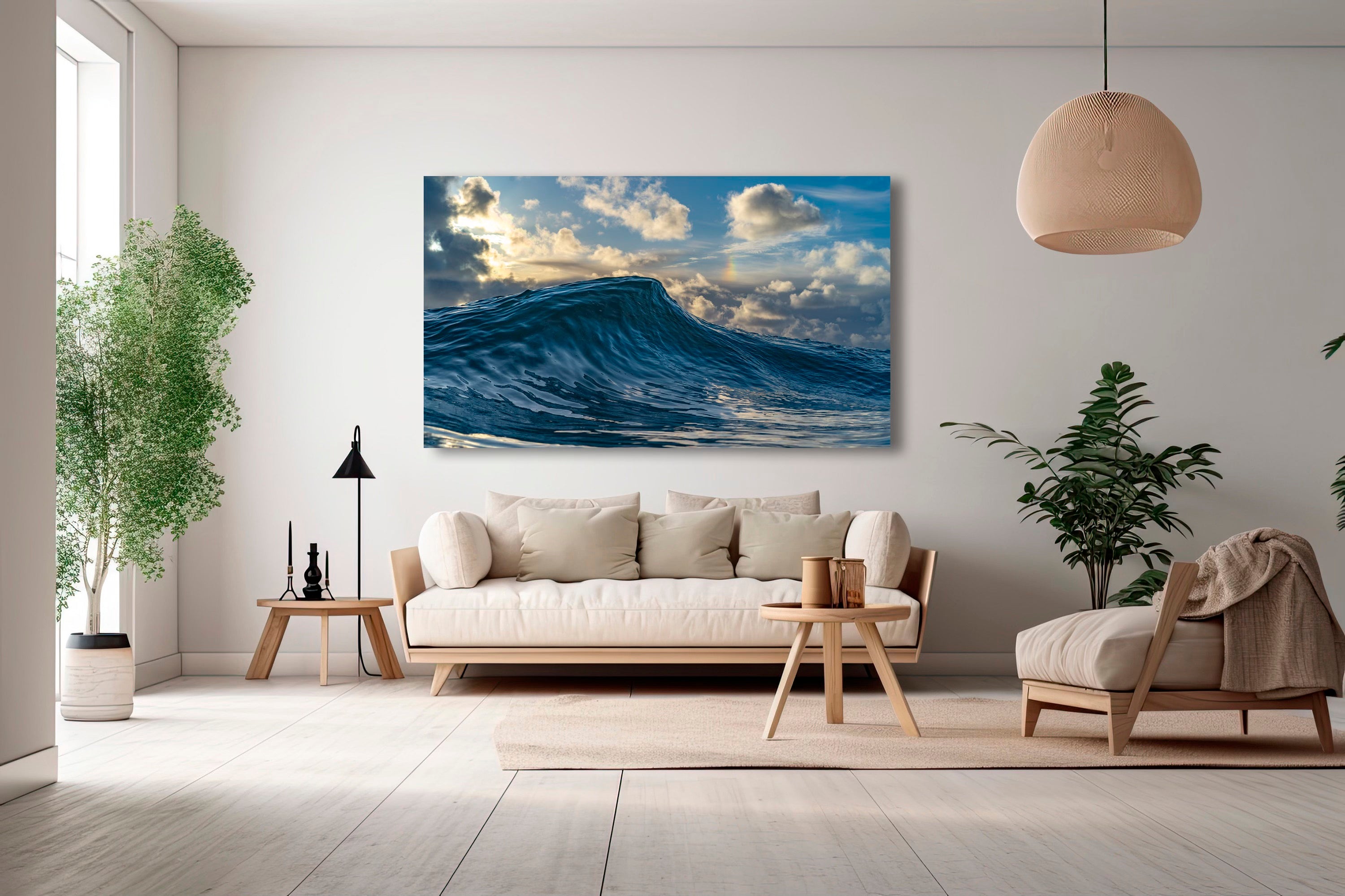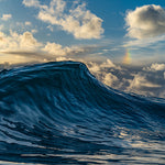 Captured in Del Mar, a blue wave seems to effortlessly touch the clouds. A rainbow catches the sun, illuminated above the scene, creating a sense of peacefulness in the moment.