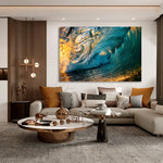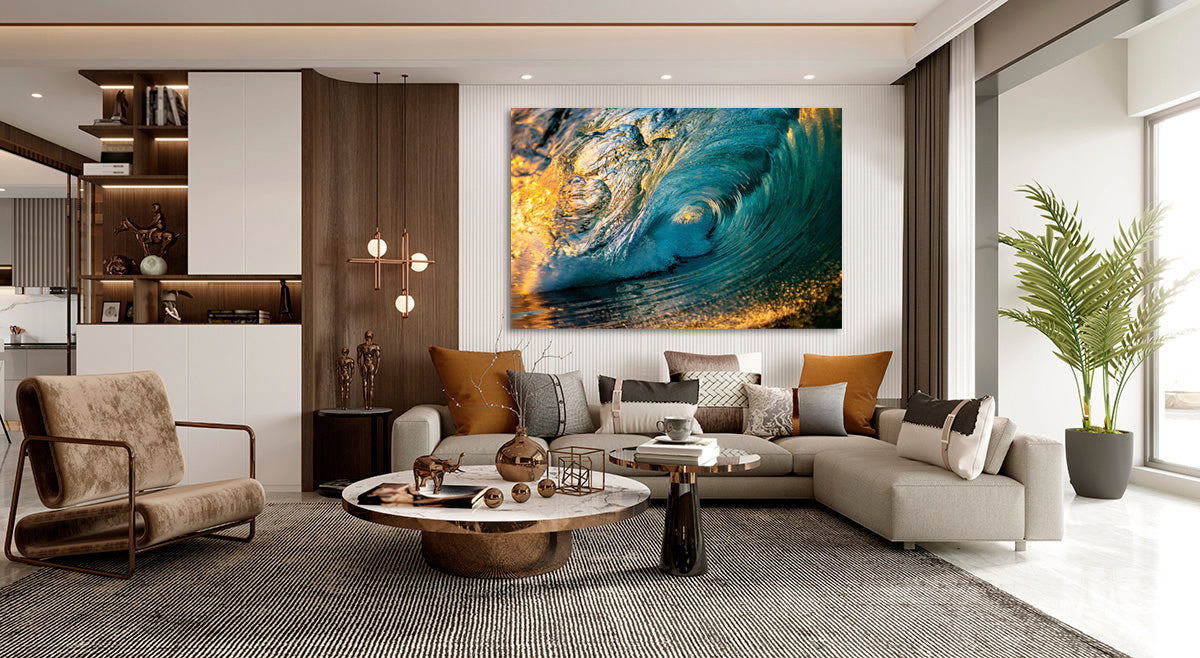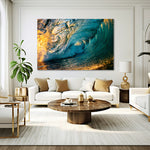 The vibrant contrast between the warm tones and deep ocean blues highlights the wave’s dynamic energy and graceful form.