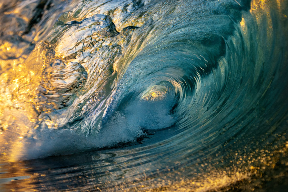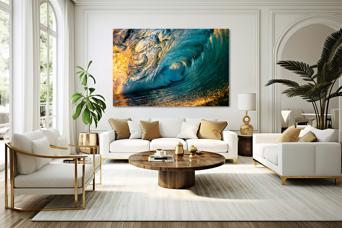 This captivating fine art photograph showcases the breathtaking beauty of a wave captured mid-motion, with sunlight casting golden hues across its surface.