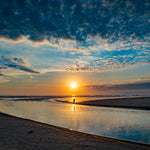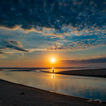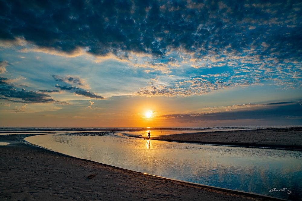 A solitary figure stands reflected in the shimmering water, embodying peace and quiet reflection under the expansive, cloud-streaked sky. This evocative Everyday Art piece celebrates the beauty of solitude, inviting viewers to pause and embrace the calm found at the day’s end.