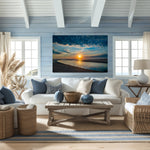 Sunset Solitude captures a serene moment as the sun sets over a tranquil shoreline, bathing the world in golden and blue hues.